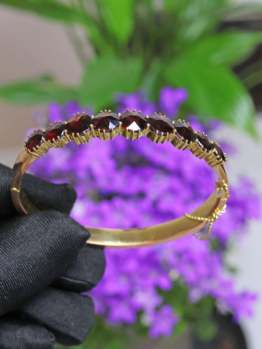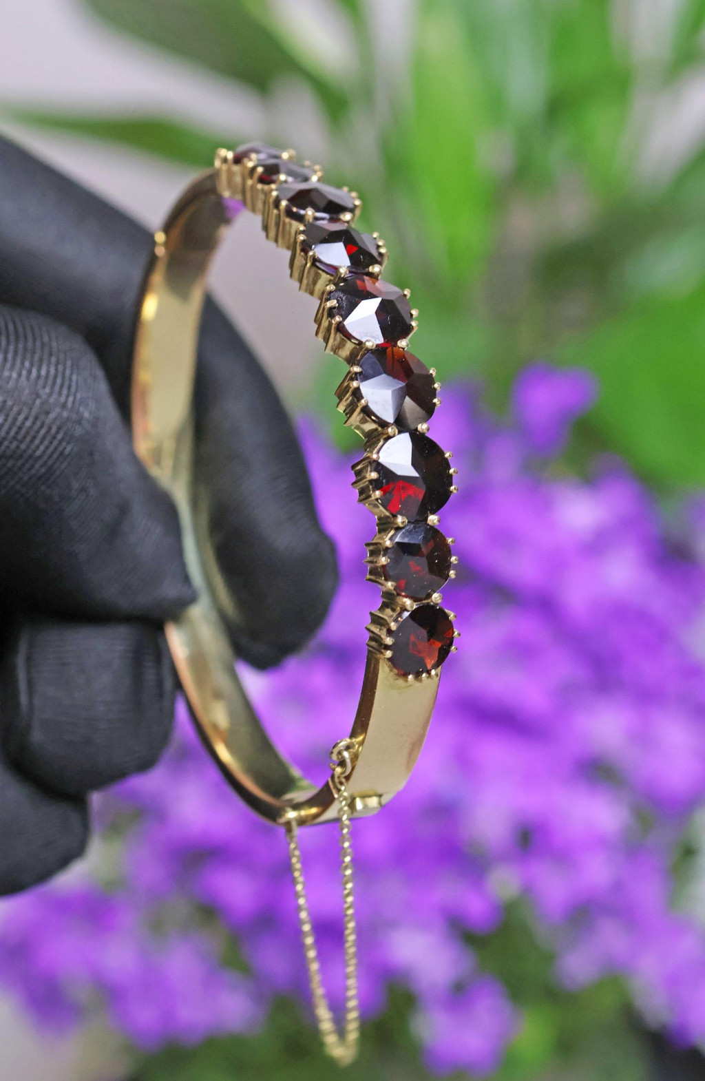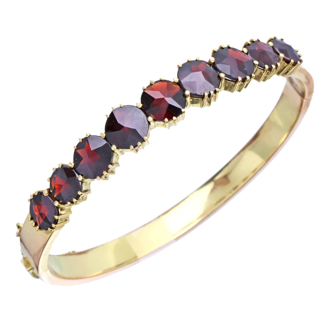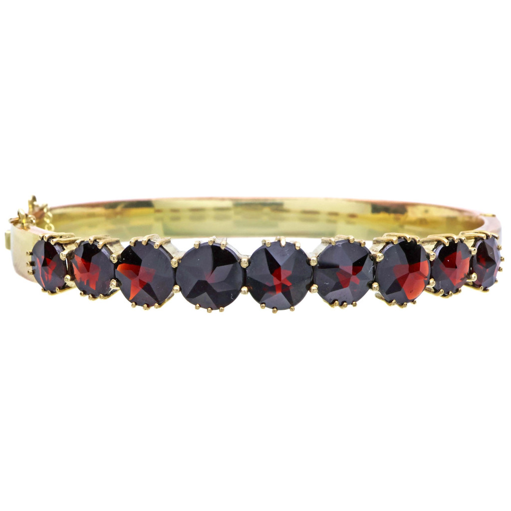 Vintage náramek z tombaku z 60. let 20. století, pozlacený a zdobený velkými broušenými granáty.