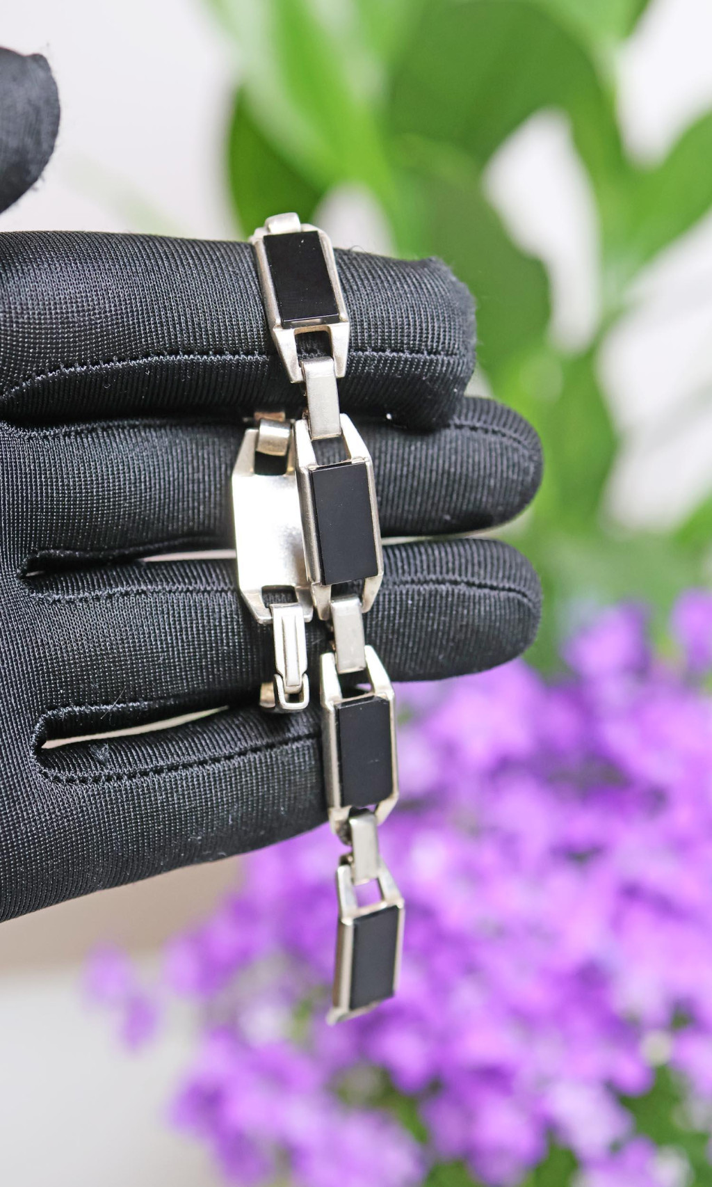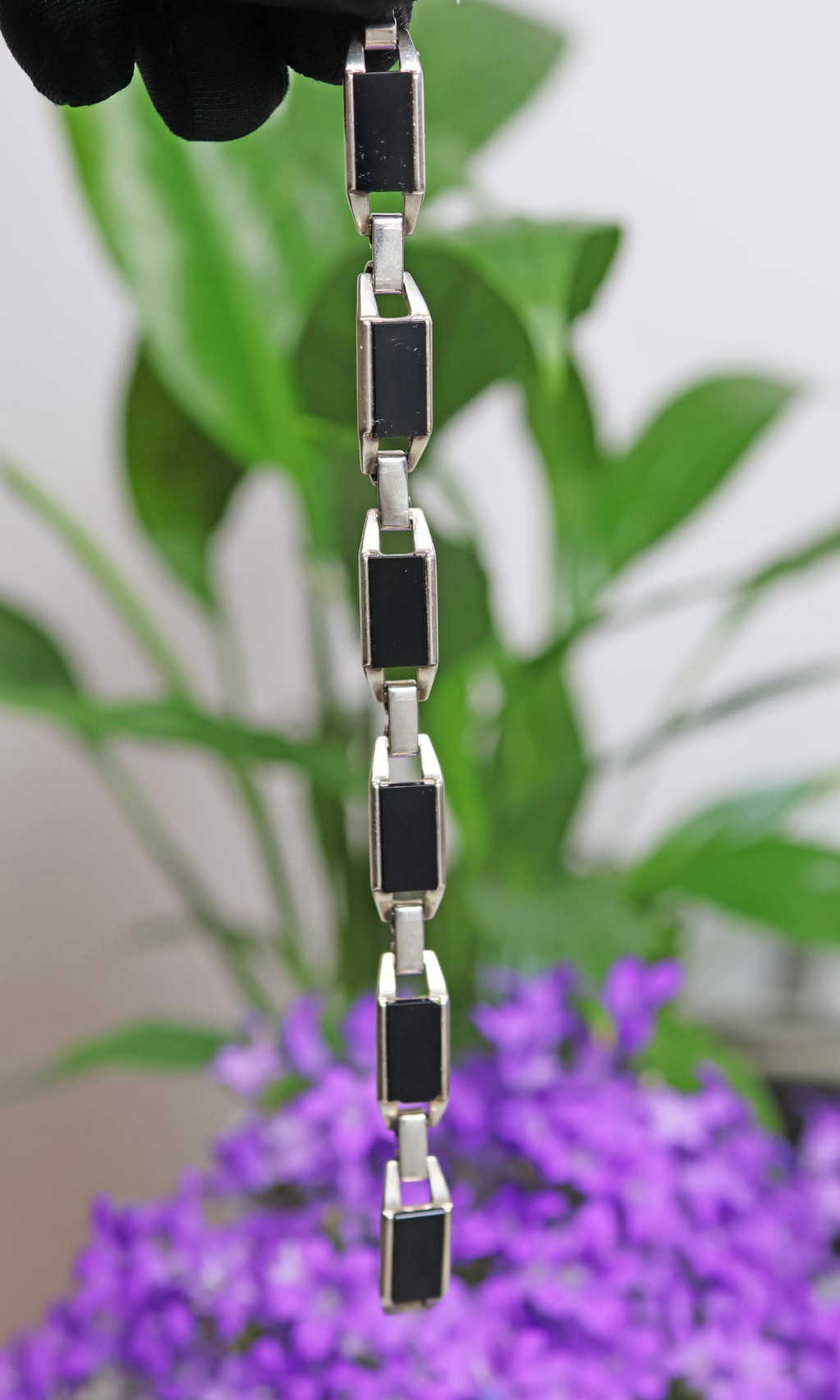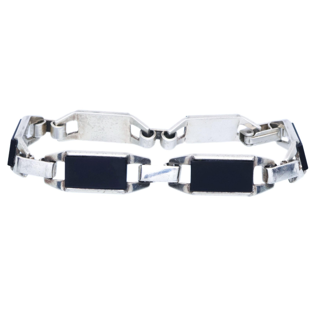 Stříbrný náramek z období kolem roku 1940, vyrobený ze stříbra ryzosti 835/1000. Náramek je zdoben šesti obdélníkovými onyxovými kameny, které jsou pravidelně rozmístěny po celé délce a vytvářejí vyvážený design.