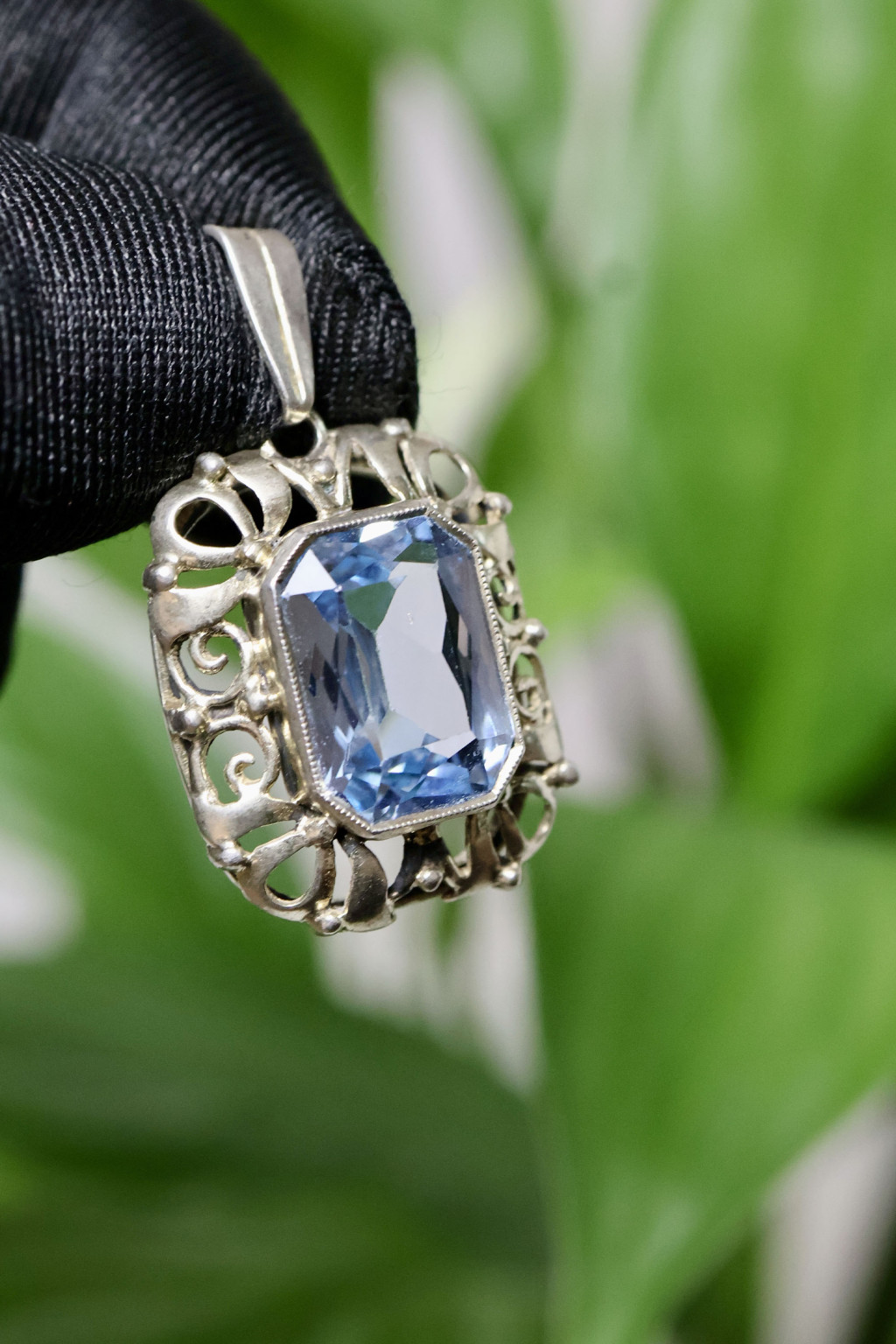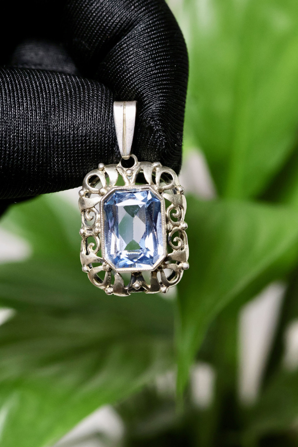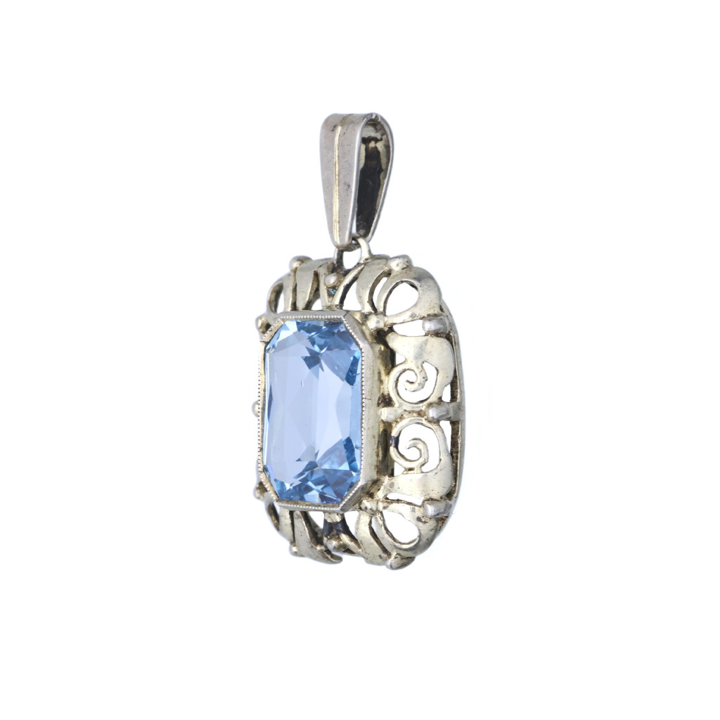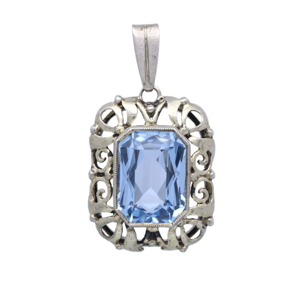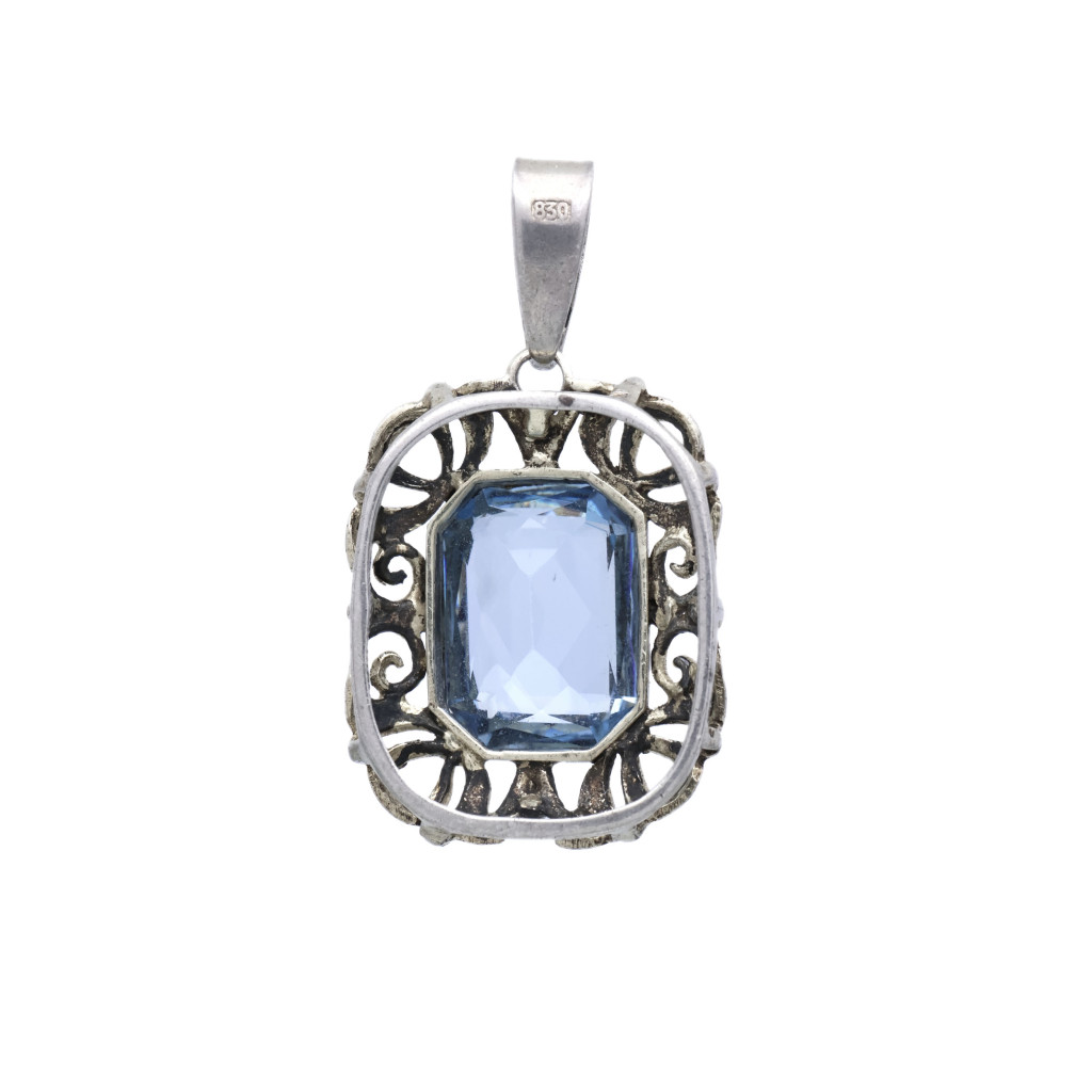 Elegantní přívěsek ze stříbra 800/1000 z období první republiky. Bohatě zdobená práce a výrazný modrý kámen.