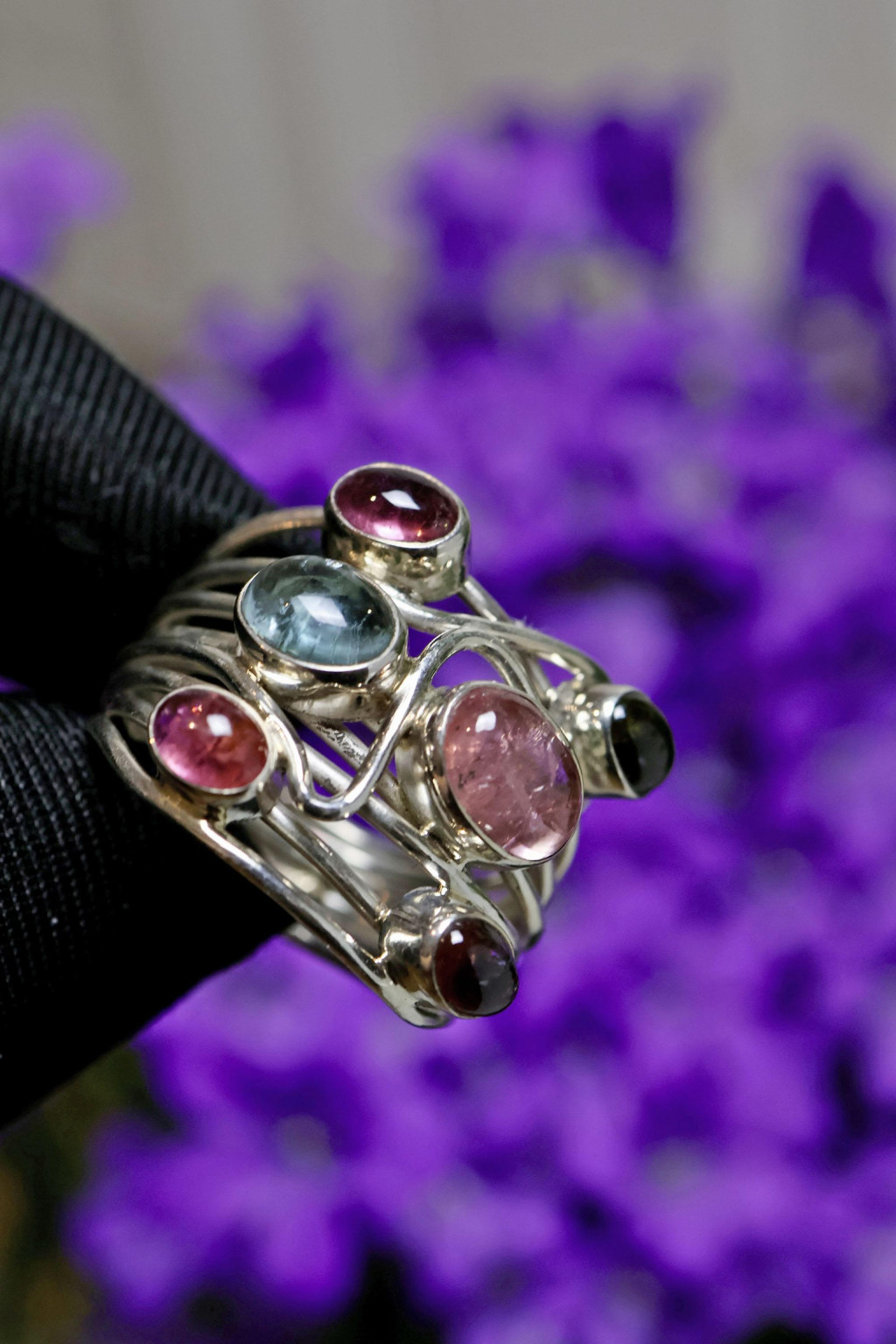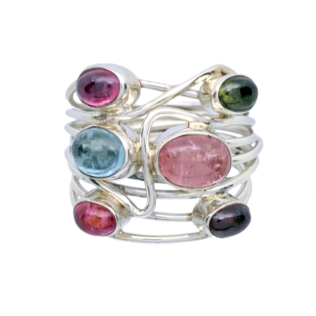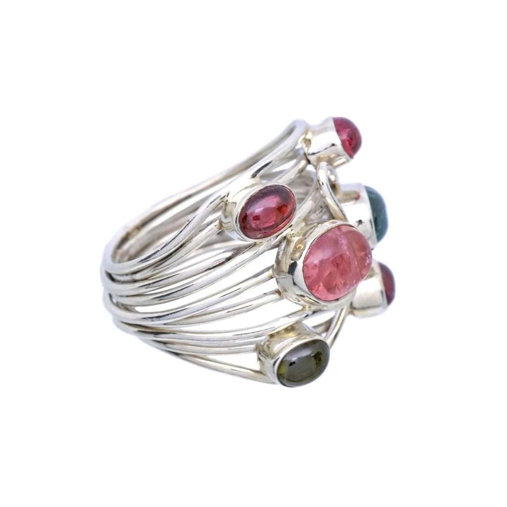 Stříbrný prsten osazen 5 přírodními turmalíny broušených do tvaru kabošonů, které zvýrazňují jejich přirozenou krásu. Vintage šperk z 90. let 20. století.