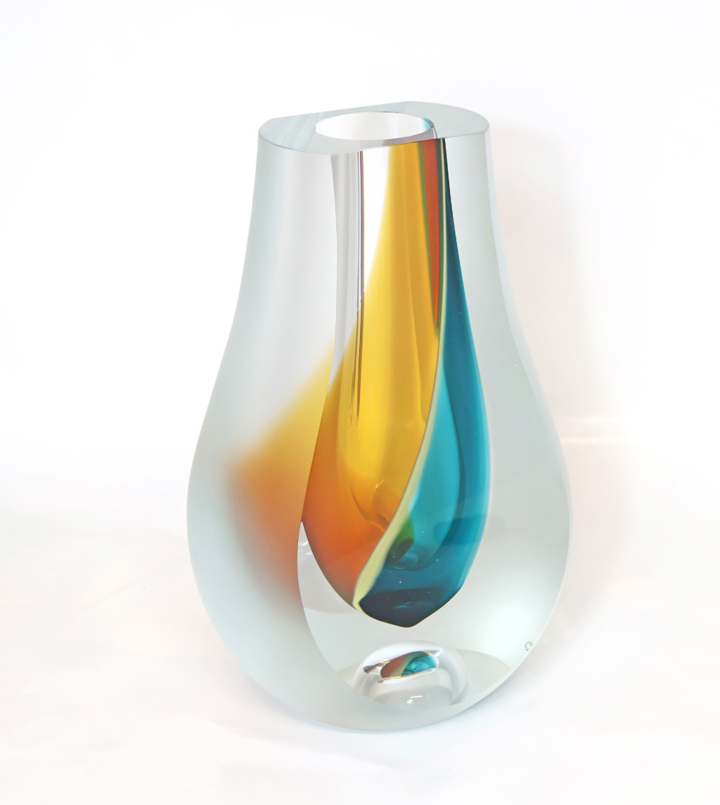 Leštěné a matované sklo s vybroušenou čočkou, bezbarvé sklo s barevným jádrem