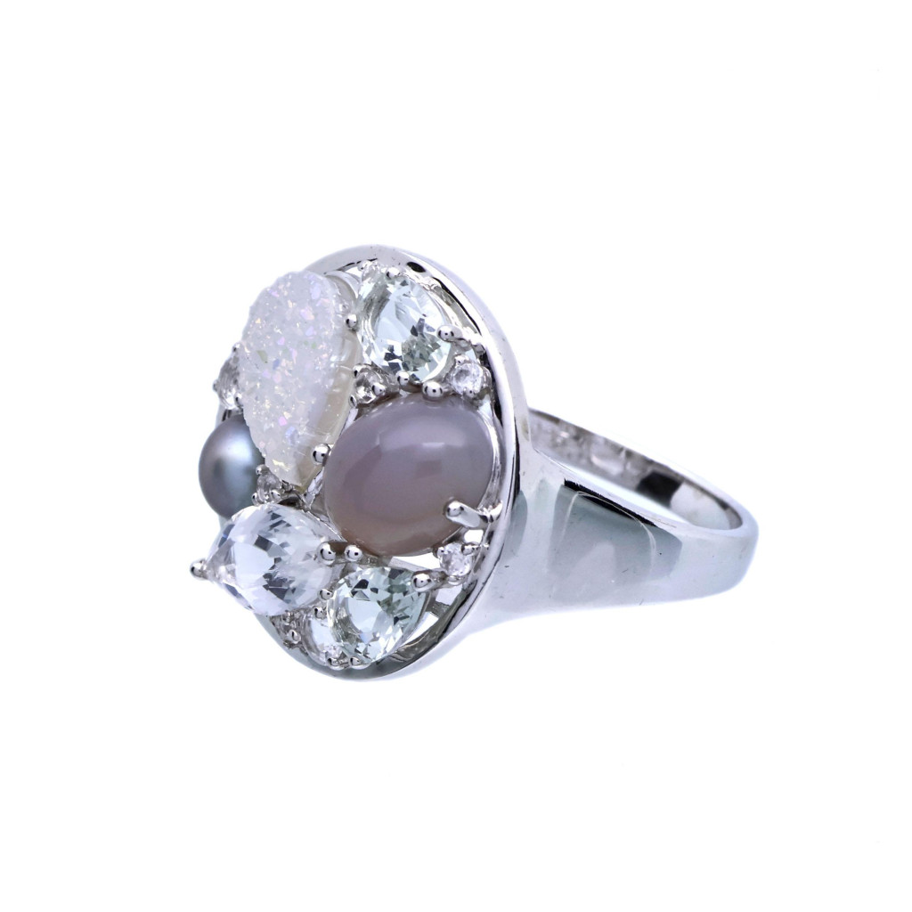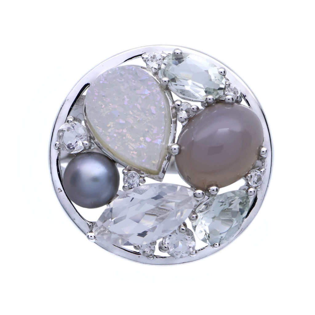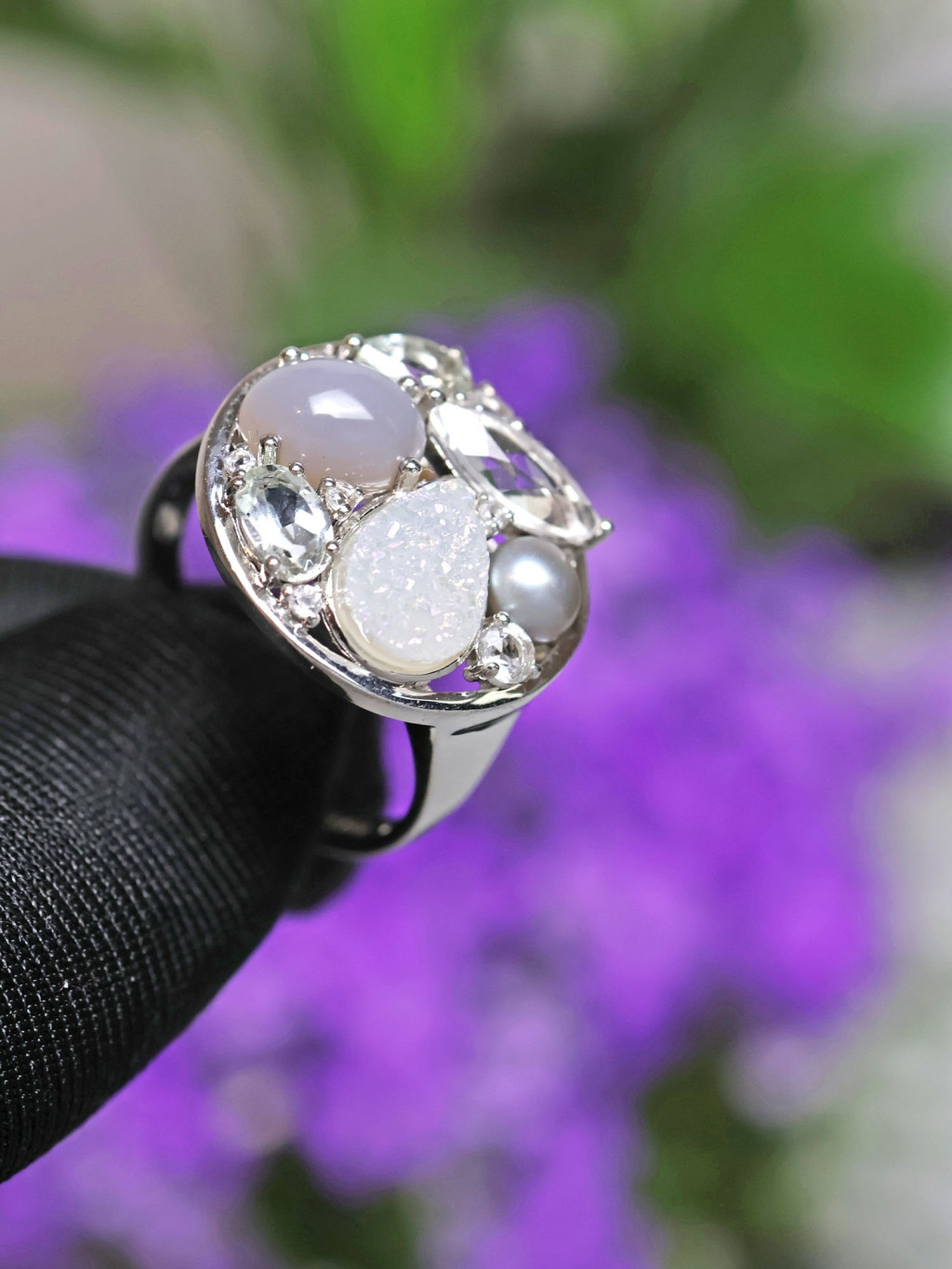 Vintage stříbrný prsten s měsíčním kamenem, perlou a křemenem